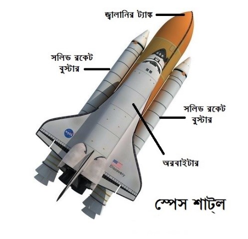এই বলে স্যার ল্যাপটপে ইন্টারনেট থেকে রকেট আর স্পেসশাট্লের ছবি দেখিয়ে বললেন – “এই এরোপ্লেনের মতন দেখতে অংশটাই শাট্ল – একে বলে অরবাইটার যা পৃথিবীর চারদিকে ঘুরতে পারে। এতে এক একবারে সাতজন অ্যাস্ট্রোনট মহাকাশে যেতে পারে। অ্যামেরিকার নাসা এ রকম পাঁচটা কর্মক্ষম স্পেস শাট্ল তৈরি করেছিল – কলোম্বিয়া, চ্যালেঞ্জার, ডিসকভারি, আটলান্টিস আর এন্ডেভার। এর মধ্যে ১৯৮৬-তে চ্যালেঞ্জার আর ২০০৩ সালে কলোম্বিয়া দুর্ঘটনায় ধ্বংসপ্রাপ্ত হয়। এতে মোট চোদ্দজন অ্যাস্ট্রোনট প্রাণ হারান যার মধ্যে রয়েছেন আমাদের প্রথম মহিলা মহাকাশযাত্রী কল্পনা চাওলা।