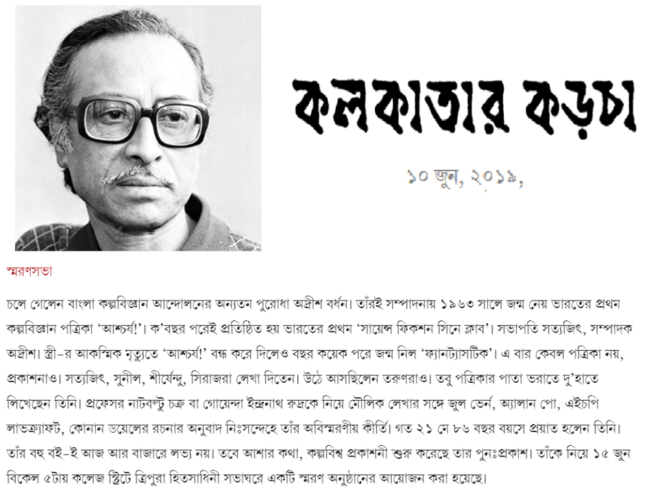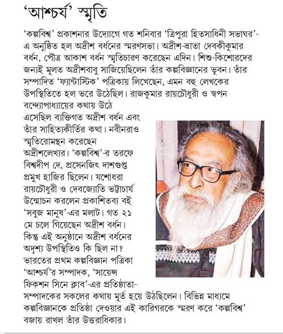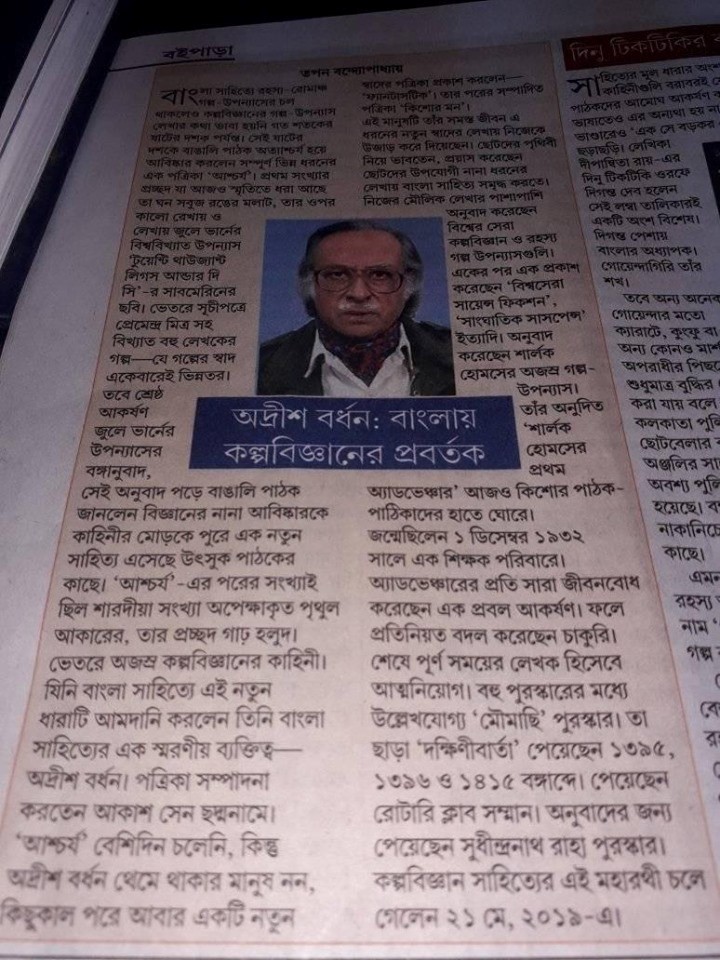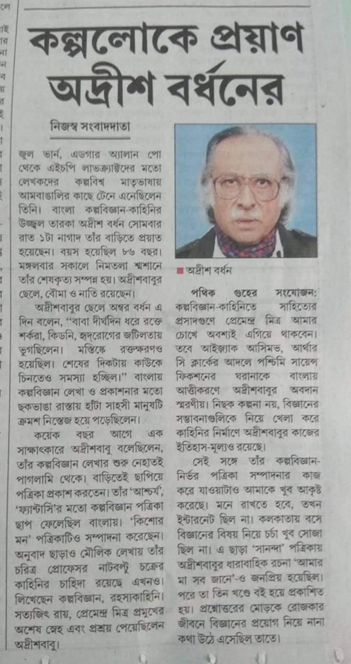 বাংলা কল্পবিজ্ঞান সাহিত্যের পথিকৃৎ এবং ‘কল্পবিজ্ঞান’ শব্দের স্রষ্টা তথা ‘আশ্চর্য’এবং ‘ফ্যান্টাস্টিক’ নামক বাংলার প্রথম কল্পবিজ্ঞান পত্রিকার সম্পাদক অদ্রীশ বর্ধন সদ্য প্রয়াত হয়েছেন। রেখে গেছেন তার অমর সৃষ্টি ‘ইন্দ্রনাথ রুদ্র’ কিংবা ‘ নারায়নী’ সহ চির স্মরণীয় চরিত্র কে।রাতের পর রাত জেগে যার মাথা অক্লান্ত পরিশ্রমে অনুবাদ করে গেছে একের পর এক এডগার অ্যালান পো থেকে শুরু করে আর্থার কোনান ডয়েল, জুলে ভের্ন