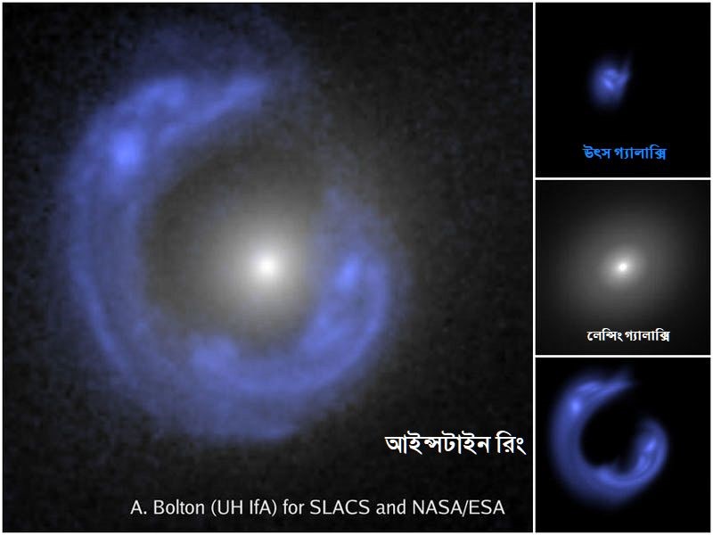 কোয়াসার আর পৃথিবীর মধ্যে সে সরলরেখা, তার সঙ্গে গ্যালাক্সি যদি পুরোপুরি সিমেট্রিক হয় – সে ক্ষেত্রে আমরা কোয়াসারের একটা রিঙের মতন প্রতিবিম্ব পাব যাকে বলা হয় আইনস্টাইন রিং। আর যদি গ্যালাক্সি কেন্দ্র লাইন থেকে সরে থাকে (off axis) তখন আলোর পথের দূরত্বের পার্থক্যের জন্য দুটো প্রতিবিম্ব ভিন্ন দূরত্বে দেখব। মহাকাশে পাঠান হাবল টেলিস্কোপ দিয়ে বেশ কিছু এই গ্র্যাভিটেশনাল লেন্সিং-এর ছবি পাওয়া গেছে। উৎস অর্থাৎ এখানে কোয়াসার, লেন্স অর্থাৎ গ্যালাক্সি আর পর্যবেক্ষক পৃথিবীর পারস্পরিক অবস্থান ও লেন্সের ভর আর আকৃতির ওপর নির্ভর করে এই লেন্সিং সবল, দুর্বল বা মাইক্রোলেন্সিং হয়ে থাকে। এই মাইক্রোলেন্সিং পদ্ধতিতে বেশ কিছু দূরান্তরের অসৌর গ্রহ খুঁজে পাওয়া সম্ভব হয়েছে। কি রকম ভাবে হচ্ছে ব্যাপারটা তোমায় বলি।