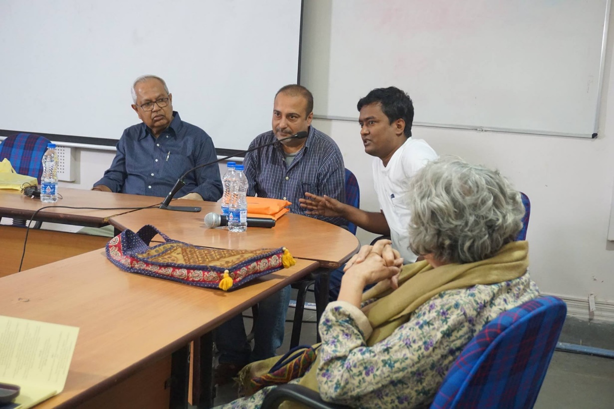 মাইকের সামনে প্রফেসর অভিজিৎ গুপ্ত, লেখক সমিত বসু ও ইন্দ্রপ্রমিত দাস