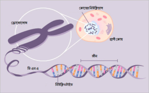 স্বাভাবিকভাবে এবার প্রশ্ন জাগতে পারে এই জিন বস্তুটা আমাদের শরীরে ঠিক কোথায় থাকে? এর উত্তর হল আমাদের প্রতিটি কোষেই এর উপস্থিতি রয়েছে। আমাদের কোষের মধ্যে জিনের ধারক ও বাহক হল ক্রোমোজোম নামক এক ধরনের সুতোর মত দেখতে অংশ যার উপস্থিতি আমাদের সমস্ত জীবন্ত কোষেই রয়েছে।