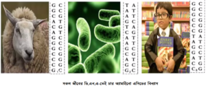 এই জিন নামক বস্তুটির মূলে আবার রয়েছে প্রকৃতির আর এক অনন্য সৃষ্টি। তার নাম ডি এন এ। ডি এন এ এমন একটি রাসায়নিক অণু যা নিজের প্রতিলিপি প্রস্তুত করতে সক্ষম। আশ্চর্যের বিষয় হল এই যে পৃথিবীর সব প্রাণীর ডি এন এ কিন্তু তৈরি হয়েছে মাত্র চারটে রাসায়নিক উপাদান দিয়ে। এই রাসায়নিক পরিবারকে আমরা বলে থাকি অ্যামাইনো অ্যাসিড। এডিনিন, থাইমিন, গুয়ানিন ও সাইটোসিন এই চারটি অ্যামাইনো অ্যাসিড দুটি সমান্তরাল সুগার ফসফেটের সুতোয় বাঁধা হয়ে সৃষ্টি করেছে পৃথিবীর সব প্রাণীর জিন। কি আশ্চর্যের বিষয় না যে সূক্ষ্মাতিসূক্ষ্ম এককোষী প্রাণের সাথে পৃথিবীর একচ্ছত্র অধিপতি মানুষের গঠনের ঐকিক স্তরে কোন পার্থক্য নেই! মানুষ বা বড় উন্নত জীবদের জিন যদিও বহুগুণ জটিল ও তাতে ডি এন এ এর সংখ্যা অনেক বেশী। কিন্তু আদতে সবই এই চার অ্যামাইনো অ্যাসিডের খেলা।