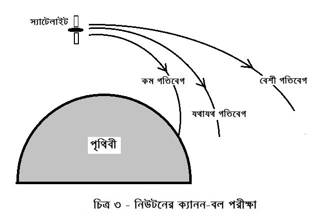 স্যার— “তা’ হলে তোমাকে একটা কাল্পনিক পরীক্ষার কথা বলি। এর নাম নিউটনের কামানের গোলার পরীক্ষা। এই পরীক্ষা দিয়ে নিউটন বলতে চেয়েছিলেন যে মহাকর্ষীয় বল সার্ব্বজনীন এবং গ্রহ সকলের গতির মূল কারণ। ধর কোনও উঁচু পাহাড়ের থেকে একটা কামানের গোলা ছাড়া হল – যদি কোনও মহাকর্ষজনিত বল কাজ না করে, আর বাতাসের কোনও বাধা না থাকে তা হলে গোলা যে দিকেই ছোঁড়া হোক সে দিকেই কোথাও না থেমে সরল রেখা বরাবর চলে যাবে নিউটনের প্রথম সুত্র অনুসারে। আর যদি পৃথিবীর মহাকর্ষ বল কামানের গোলাকে আকর্ষণ করে তবে তার গতিপথ নির্ভর করবে গোলার প্রাথমিক বেগের ওপর। গোলা চাইবে যে দিকে ছোঁড়া হয়েছে সে দিকে যেতে আর মহাকর্ষজনিত বল তাকে টানবে উল্লম্বভাবে নীচের দিকে। ফলে সে অধিবৃত্তাকার পথে চলবে। যদি প্রাথমিক গতিবেগ কম হয় তবে গোলা একটা নির্দ্দিষ্ট উচ্চতায় পৌঁছে আবার পৃথিবীর মাটিতে পড়বে। গোলার অনুভূমিক গতিবেগ যদি প্রতি সেকেন্ডে প্রায় ৭.৩ কিলোমিটারের কাছাকাছি হয় তখন গোলা কোনও নির্দ্দিষ্ট উচ্চতায় পৌঁছে আবার পড়বে কিন্তু পৃথিবীর মাটিতে নয়— শূন্যেই পড়তে থাকবে। একদিকে তার গতিবেগের ফলে সে সোজা পথে চলে যেতে চাইবে আর পৃথিবীর অভিকর্ষের জন্য ক্রমাগত বাধা পেয়ে প্রতি মুহূর্তেই দিক পরিবর্তন করবে যেহেতু গোলার আগুয়ান গতি আর অভিকর্ষ-জনিত পতনের গতি সমান— আর তার ফলে গোলা কোনও কক্ষপথে পৃথিবীকে কেন্দ্র করে বৃত্তাকার বা উপবৃত্তাকার পথে অবিরত ঘুরতে থাকবে। চাঁদ যেমন পৃথিবীর চারদিকে ঘোরে, পৃথিবী যেমন সূর্যের চারদিকে ঘোরে এই কৃত্তিম উপগ্রহ বা স্যাটেলাইটগুলোও তেমনি পৃথিবীর চারদিকে ঘুরছে।